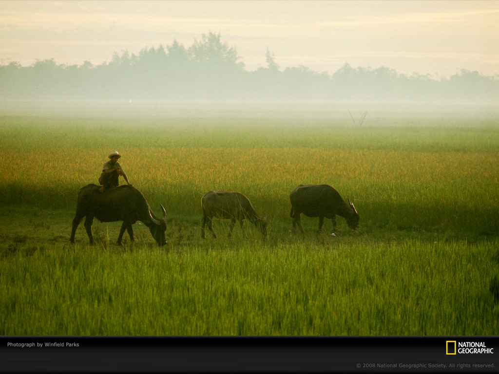 在距离越南南部城市顺化不远处,一个骑在牛背上的男孩在薄雾蒙蒙的田野中放牧着三头水牛。这幅宁静的画面拍摄于1966年,用于掩饰美国卷入了越南战争后给整个地区带来的前所未有的混乱。