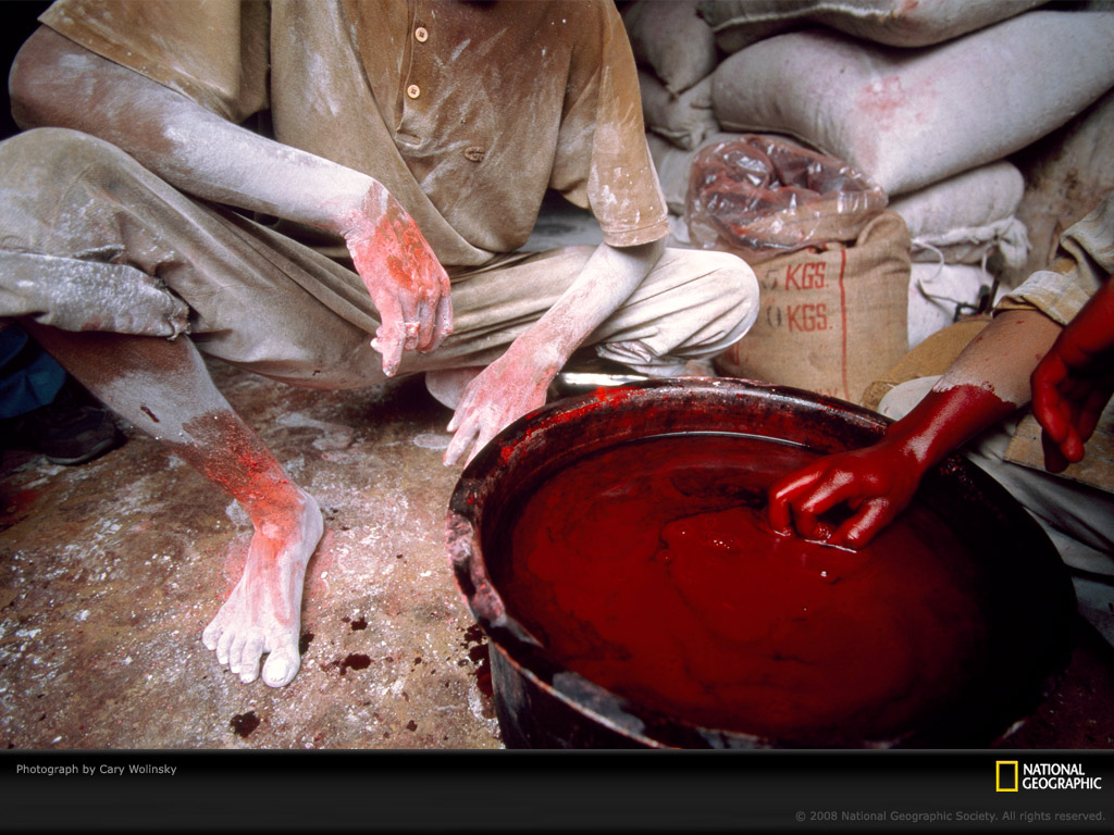 在印度德里的染料市场上,两个年少的孩子正在调配染料。调配之后,这些鲜红色的染料将与玉米面混合起来,最后摊在屋顶上晾干。到了五彩缤纷的胡里节,狂欢者们将会用这些准备好的粉末互相泼洒。