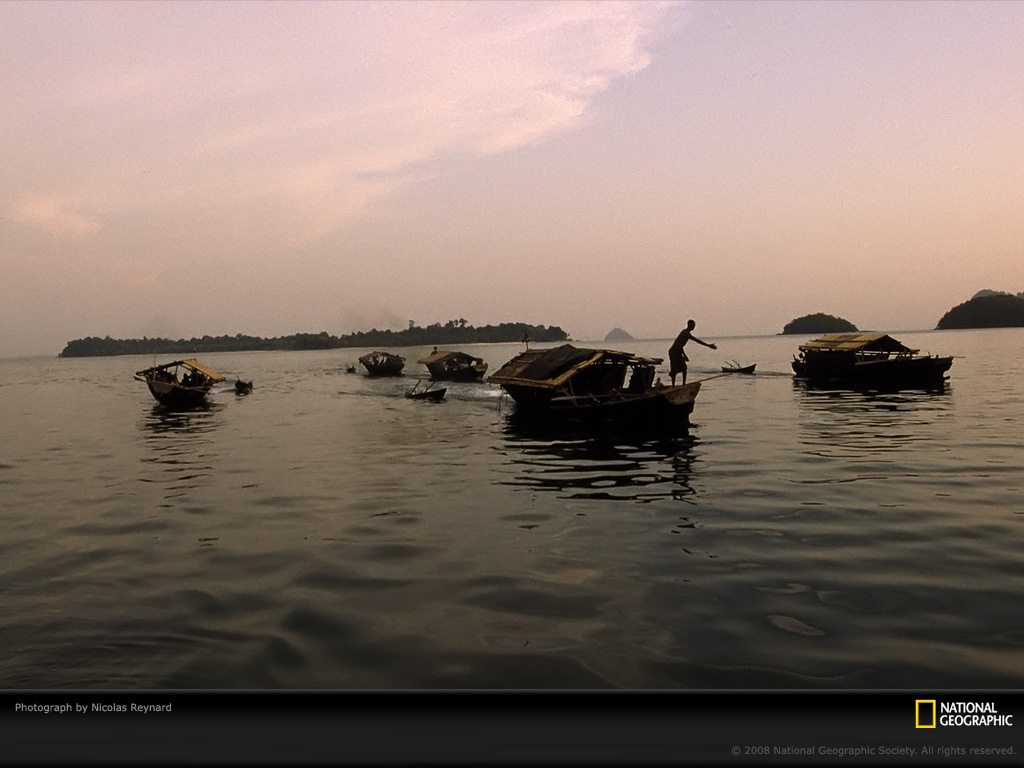 缅甸丹老群岛海岸线以外的安达曼海,莫肯族的渔民正在自己的船上工作。这个海上游牧民族的成员们往往会在他们的船上度过生命中的大部分时间,就在群岛内的800个岛屿周末捕鱼、潜水、正如部族古语所云:“莫肯族人出世、生活和死亡全都在海上,就连他们小孩的脐带都是扔到海里的。”