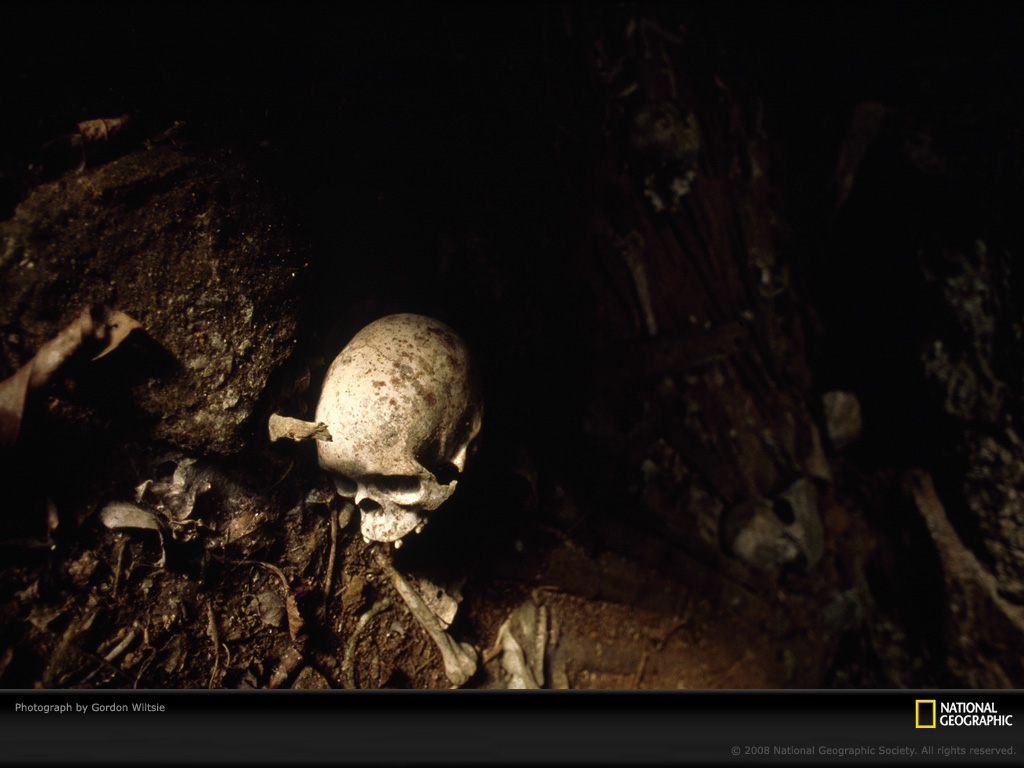 所有秘鲁云人(又称迦迦波亚人)的残骸都躺在泥泞的墓葬中,如图中这个在安第斯山脉东部斜坡发现的头颅。古老的迦迦波亚文明起始于9世纪到15世纪。迦迦波亚人在山顶修建堡垒,强烈抵抗印加的侵略。数世纪来,许多迦迦波亚人的陪葬品已经被盗墓者洗劫一空。
