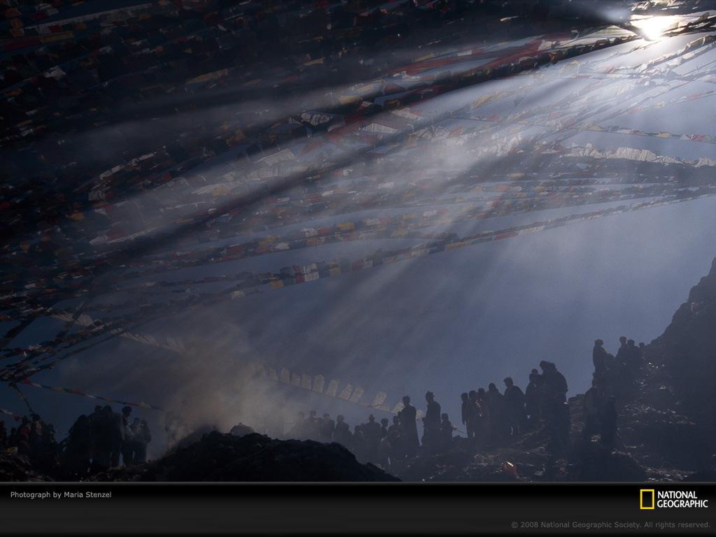 西藏拉萨,这是新年时期,祈祷香火形成的烟雾,令阳光照射下的祷告旗帜如同置身于云中。这些由杜松子和艾属形成的芳香烟雾,被认为可以令土地和天空的精神得到欢愉。