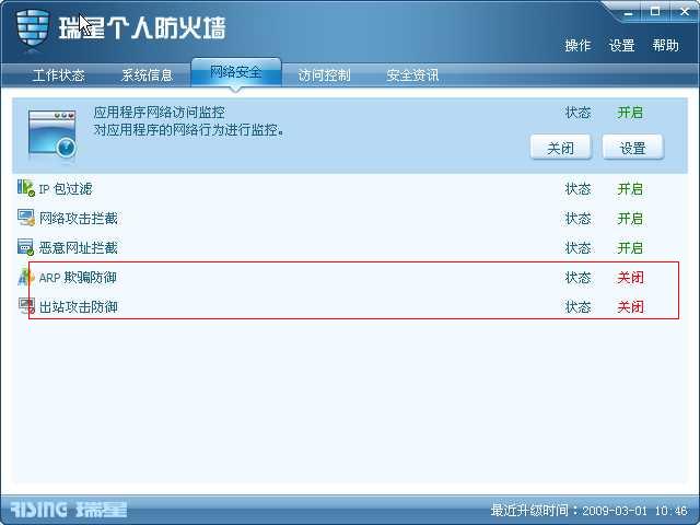 我的防火墙从2008更新到2009 目前版本是21.27.60 今天偶然发现一个奇怪问题 打开[网络安全]选项 发现 "ARP欺骗防御"和出站防御攻击"默认都是关闭 请问大伙的防火墙更新到这个版本是否都是这样?