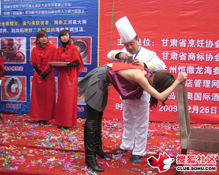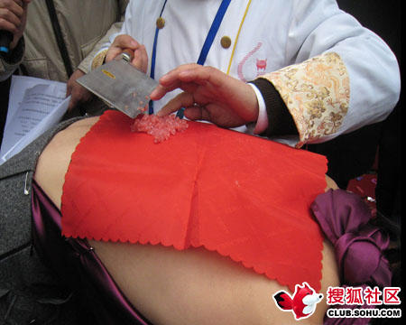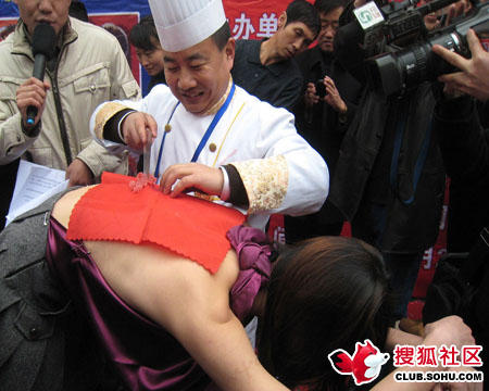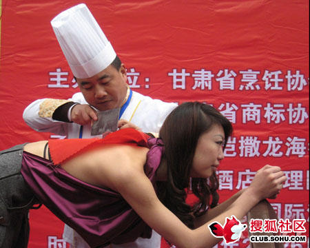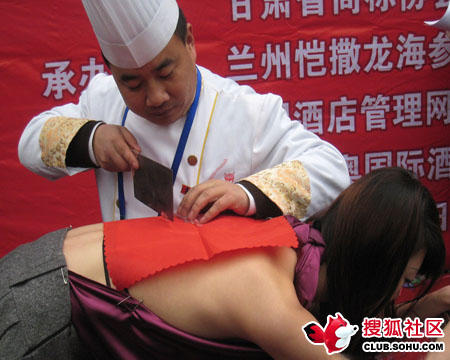 兰州街头一厨师在表演在美女背脊上切肉。当日,兰州一场大雪,雪后气温降到了零下3度,为吸引顾客,商家让厨师在美女背脊上表演切肉丝、剁肉末等厨艺绝活。