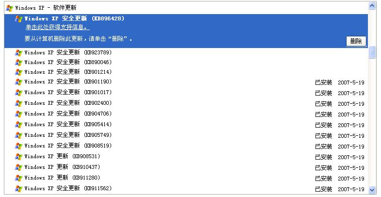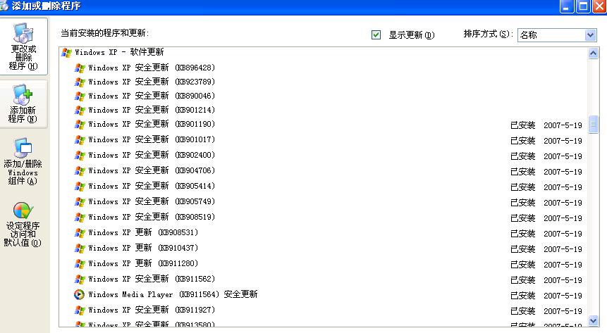 今天打开添加/删除程序发现XP的安全更新补丁有4个和别的不一样,如下图:
