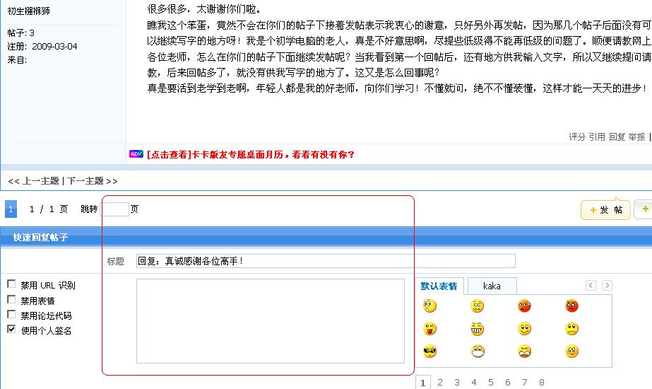 瞧我这个笨蛋,竟然不会在你们的帖子下接着发帖表示我衷心的谢意,只好另外再发帖,因为那几个帖子后面没有可以继续写字的地方呀!我是个初学电脑的老人,真是不好意思啊,尽提些低级得不能再低级的问题了。顺便请教网上各位老师,怎么在你们的帖子下面继续发帖呢?当我看到第一个回帖后,还有地方供我输入文字,所以又继续提问请教,后来回帖多了,就没有供我写字的地方了。这又是怎么回事呢?