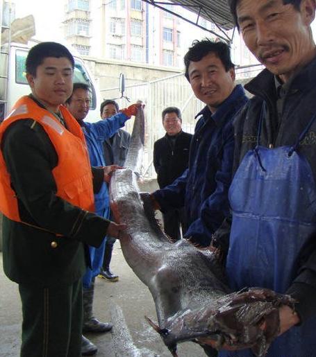 3月3日,在浙江宁波北仑一码头,一名海警协助几位渔民抬起一条从舟山渔场捕获的巨型带鱼。据悉,这条带鱼长3.4米、重12公斤。据船长介绍,他捕了20年的鱼,还是第一次见到这么大的带鱼。