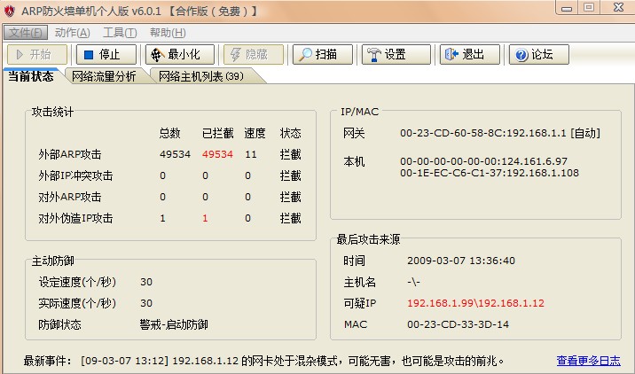 话说我用的是单独的网线。 但是ARP防火墙一直提示我有外部攻击