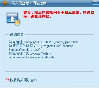 我公司服务器中的网页打开后瑞星提示"木马入侵提示",如下内容: