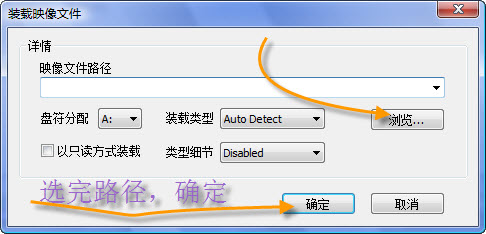3.如下图,先点“浏览”,然后选好要装载的映像文件,最后点“确定”。