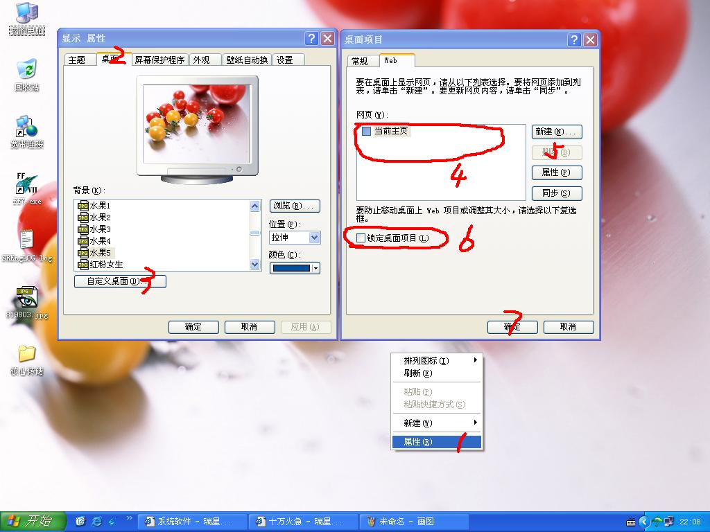 右键桌面空白处,然后按步骤操作,在步骤4处取消所有勾选,然后把网站项目一一点中,再单击5处的按钮一一删除(不要删除“当前主页”这个项目),然后取消6处的勾选,最后点7处的“确定”。