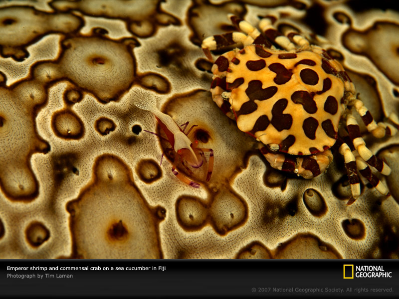 在斐济群岛的海洋中,一只皇帝虾和一只共生螃蟹几乎消失在印花布模式和一个大的豹纹海参。海参提供食品给甲壳类方式在它皮肤的黏液和当危险威胁到它时有胃内的有毒物质做为防御工具。