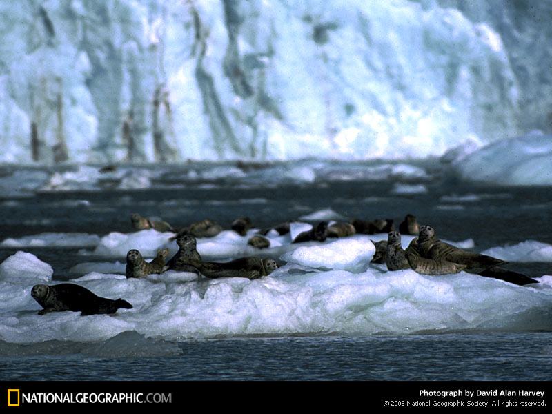 一群海豹在浮冰上休息,前面是阿拉斯加冰河湾的Muir冰河。许多种类的海豹有厚的皮毛和一层厚的海兽脂――那有11~13厘米厚在皮肤的下面。这层油脂就像绝缘层,同时也是海豹储存能量为了它们找不到食物时可以将油脂转化为能量。