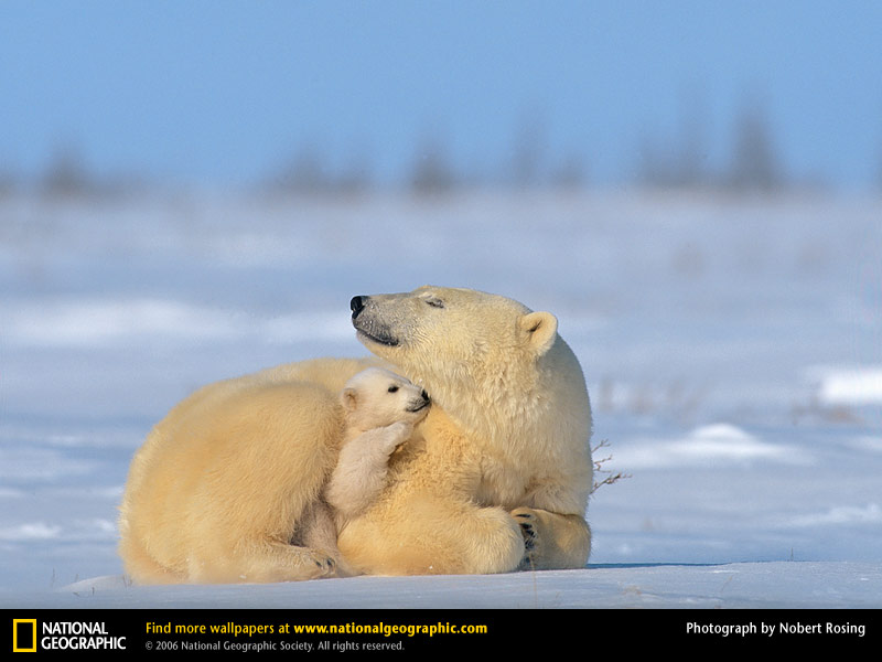 一只三个月大的小北极熊找到舒适的地方,在它妈妈的怀里得到温暖。