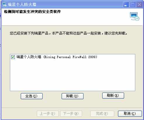 我的瑞星是2004版的,3月初重新装了一次机器,在瑞星网址上下了当时的最新版本,安装使用都正常,但在3月12日升级时提示"您已经安装下列瑞星产品,本产品不能和这些产品一起安装,建议您先卸载.",我想可能是又换版本了,将原版本卸载并删除其目录,在瑞星网址上重新下了rfwo109.exe,但重新安装后,仍然出现上面的提示并无法升级,是什么原因?