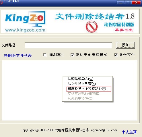 使用说明:(先勾选抑制再生)删除时复制所有要删除文件的路径,在待删除文件列表里点击右键选择从剪贴板导入,导入后在要删除文件上点击右键,(在待删除文件列表里点击右键选择从剪贴板导入不检查路径,)选择立刻重启删除,电脑会重启进入DOS界面进行删除操作。运行xdelbox前最好卸载所有可移动存储介质(包括U盘,MP3,手机存储卡等)。