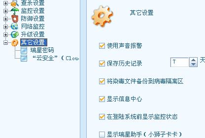 打开杀毒软件,点击设置——详细设置,点击其他设置,将显示瑞星助手前面的勾取消。