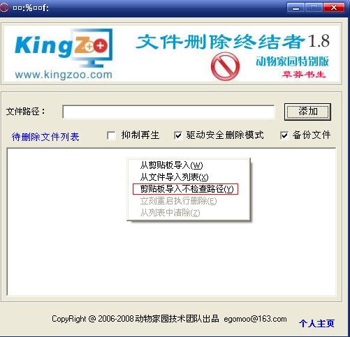 使用说明:(先勾选抑制再生)删除时复制所有要删除文件的路径,在待删除文件列表里点击右键选择从剪贴板导入,导入后在要删除文件上点击右键,(在待删除文件列表里点击右键选择从剪贴板导入不检查路径,)选择立刻重启删除,电脑会重启进入DOS界面进行删除操作。运行xdelbox前最好卸载所有可移动存储介质(包括U盘,MP3,手机存储卡等)。