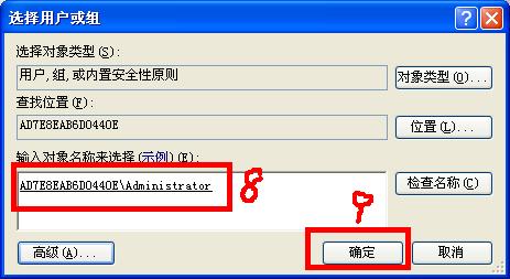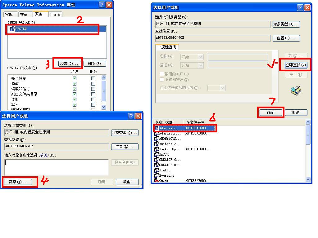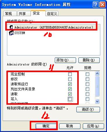 二、单击“安全”标签后,发现2处的列表中只有system帐户,当前用户不在列表内,因此不能访问该文件夹就很正常了。依次执行步骤3、4、5后,在步骤6处理选择你的当前帐户单击,然后执行步骤7: