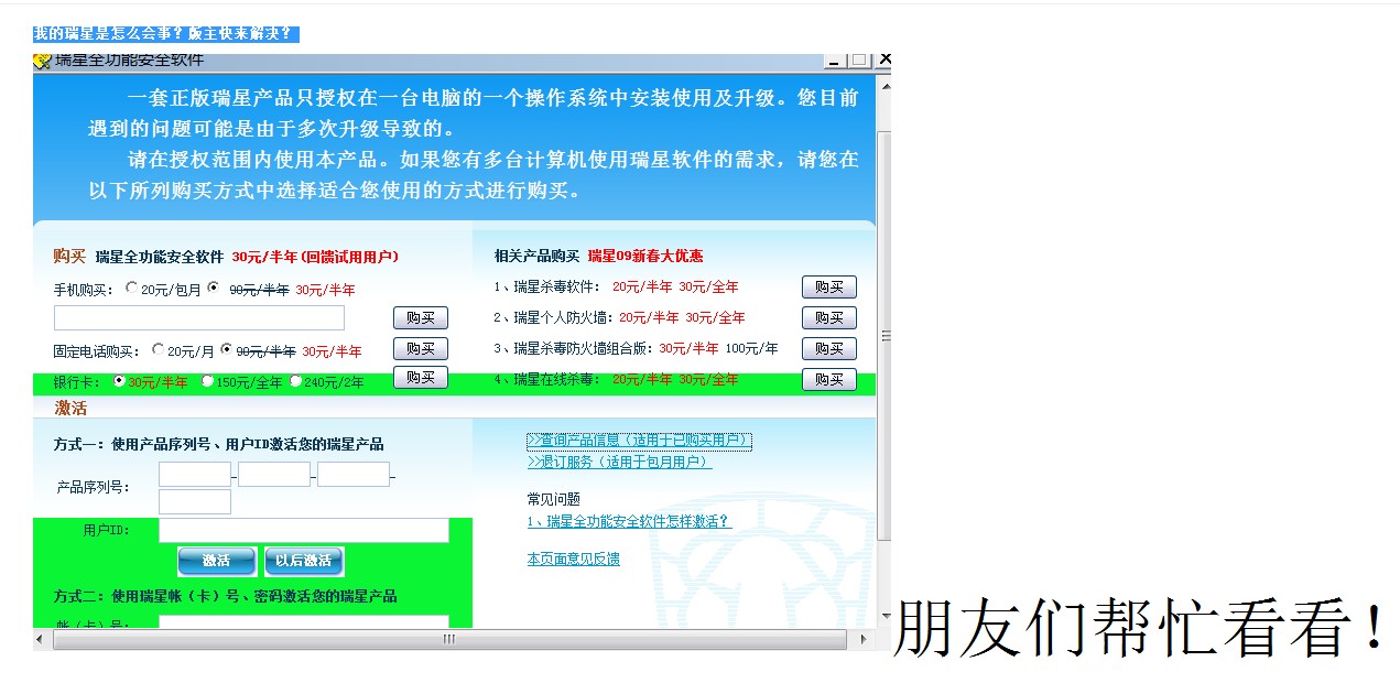 二.没有重新安装瑞星,出现这种提示的,可能是这一套产品安装了多台电脑(瑞星只允许一台电脑一个操作系统使用)。