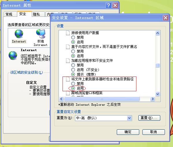打开IE8-》工具-》Intelnet选项-》安全-》自定义级别-》将文件上传到服务器时包含本地目录路径-》启用-》确定