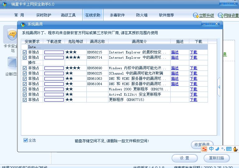 我使用卡卡扫描漏洞后准备下载,却有如上提示。开始我以为真的是空间不足,就修改了下载路径,可是还是那样的提示,可是我的磁盘空间最小的也有5G,难道这也不够!
