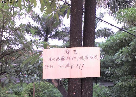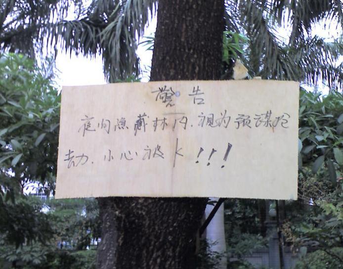 雷人警示牌:夜晚藏树丛视为预谋抢劫!