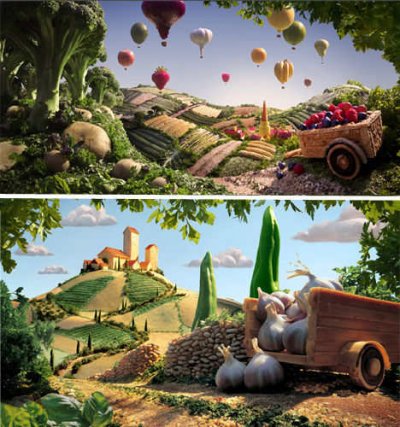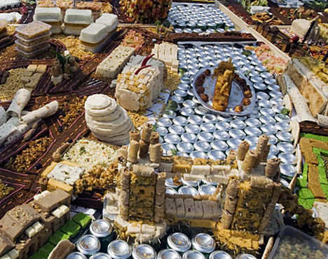 10、可食风景 45岁的英国摄影师卡尔·华纳以蔬菜、肉类、奶制品以及鱼类产品为原料,搭建出了很多幅靓丽的、栩栩如生的风景画。他先在头脑中勾勒出了一幅幅景象,然后再去买原料,并用曲别针和强力胶水将它们粘合在一起。他用三文鱼肉做海,椰菜当树,面包做山,奶酪当屋,牛肉变雪景,就这样,创造出了"椰菜森林","奶酪山庄","蔬果热气球嘉年华"、"牛肉天堂"等美轮美奂的作品。若不是使用了一些化学原料,而且创造周期太长导致食物变质,否则你真的可以一一"品尝" 这些风景了。