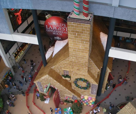 2、世界最大的姜饼屋世界最大的姜饼屋可能正好比你家大,其面积居然多达135平方米,是由1.4万磅(合6342千克 姜饼和4750磅(合2152千克 糖霜建造而成的。姜饼艺术家罗格·皮尔泽花了1700个小时才建造此房屋,成为世界最大的姜饼屋,并于2006年展示在美国购物中心里。