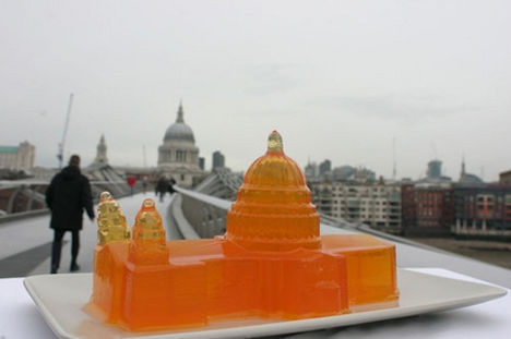 8、果冻建筑 2008年在伦敦举行的果冻建筑盛会上,一千名建筑师上演了果冻建筑魔幻的一幕:印度泰姬陵颤颤巍巍,俄罗斯克里姆林宫摇摇欲坠,世界各地著名建筑呈半透明橙红色……作为英国建筑界最大规模的盛事"伦敦建筑节"活动之一,这场"设计一个果冻"比赛要求参赛者用草莓果冻作原料,建成融入现代建筑思想的作品。此图片是一个最令人难忘的果冻建筑。