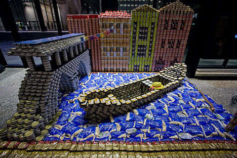 9、罐头建筑当你还是孩子时,你可能还记得在学校将罐头食品堆成摩登塔,但这远没有此罐头建筑那么令人印象深刻。加拿大多伦多大学的学生和专业建筑师组成的团队,用罐头设计和建造了商行和公司,酷似儿童课本上的插图。此外,他们还设计和建造了城市风景、树木、蜜蜂甚至积木搭建的人。