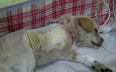 前几天,有一只小狗被狠毒的残害了!不知道什么人把它的前腿的皮给剥了,扔在了街上。还好路过的好心人把它送进了医院,经过几天的时间小狗的伤已经治愈,但前腿已节肢。医院一直在催促医药费 ,全部的费用是4000元左右。