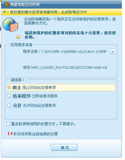 每次开机 双击我的电脑 图片 时瑞星总提示注册表修改 有一次烦了容许修改 结果把主页改了 重新修复主页 再开机又提示 ...... 1 程序名称C:\DOCUME~1\ADMINI~1\LOCALS~1\TEMP\SETACL.EXE