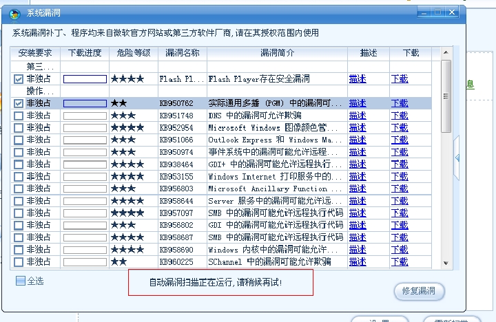 已解决。原因是我把设置里的存放漏洞的目录改到D盘结果,卡卡还在原来C盘默认的设置下更新漏洞,造成了“自动扫描正在进行”