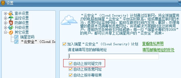 是可疑文件 可以选择自动上上报 然后在邮箱中可以获得来自瑞星“云安全”平台的支持与安全保障,共享最新的“云安全”成果