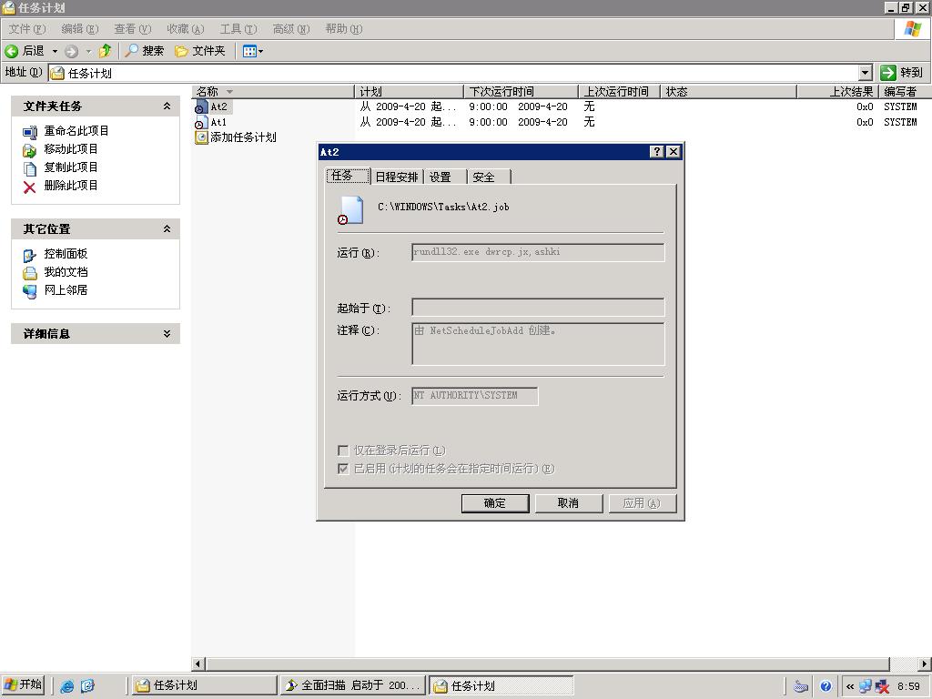 请教各位高手:现在电脑有个奇怪的现现,就是不停的添加计划任务,该任务调用某个未知的文件(病毒),只要该任务运行,防病毒软件就会有提示,如附件所示,系统为2003,补丁都打齐了,是什么原因,该怎么防护,谢谢。