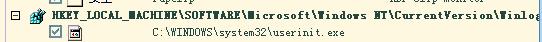 这个就是那个重要的userinit.exe启动项了,但是前面的图片显示的是丢失的意思,也就是说这个系统文件:userinit.exe被病毒替换了,而且现在被删除了。