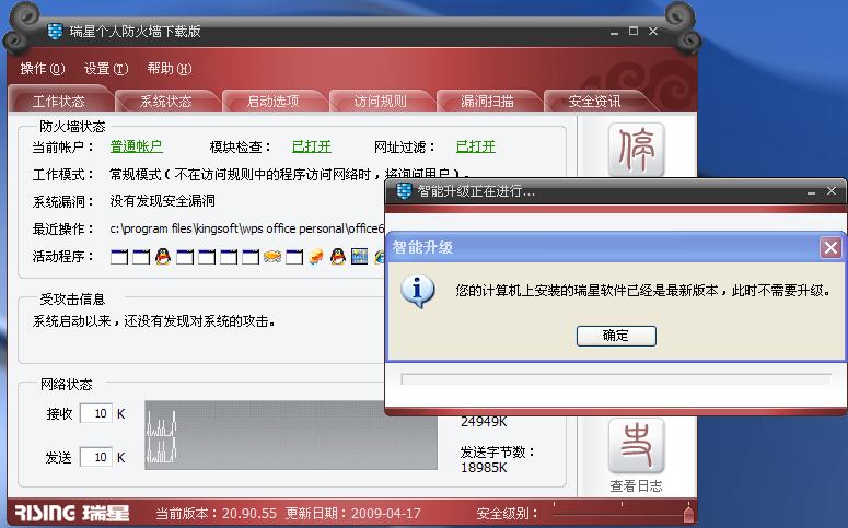 前段时间又用回了08版本的防火墙了,安装后的版本是20.30.64,之前一直不敢升级,(因为一升级就到了09版本了),昨晚报着试试看的态度点了升级,结果升级到最新版本了20.90.55 (09版本最新是21.34.62) 08版本的瑞星墙最新版本是209050吗?