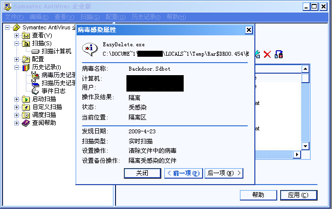 本来想查查机器有没有猫藓下载器,结果在置顶贴里的工具中下载了EasyDelete,被诺顿报警,图如下: