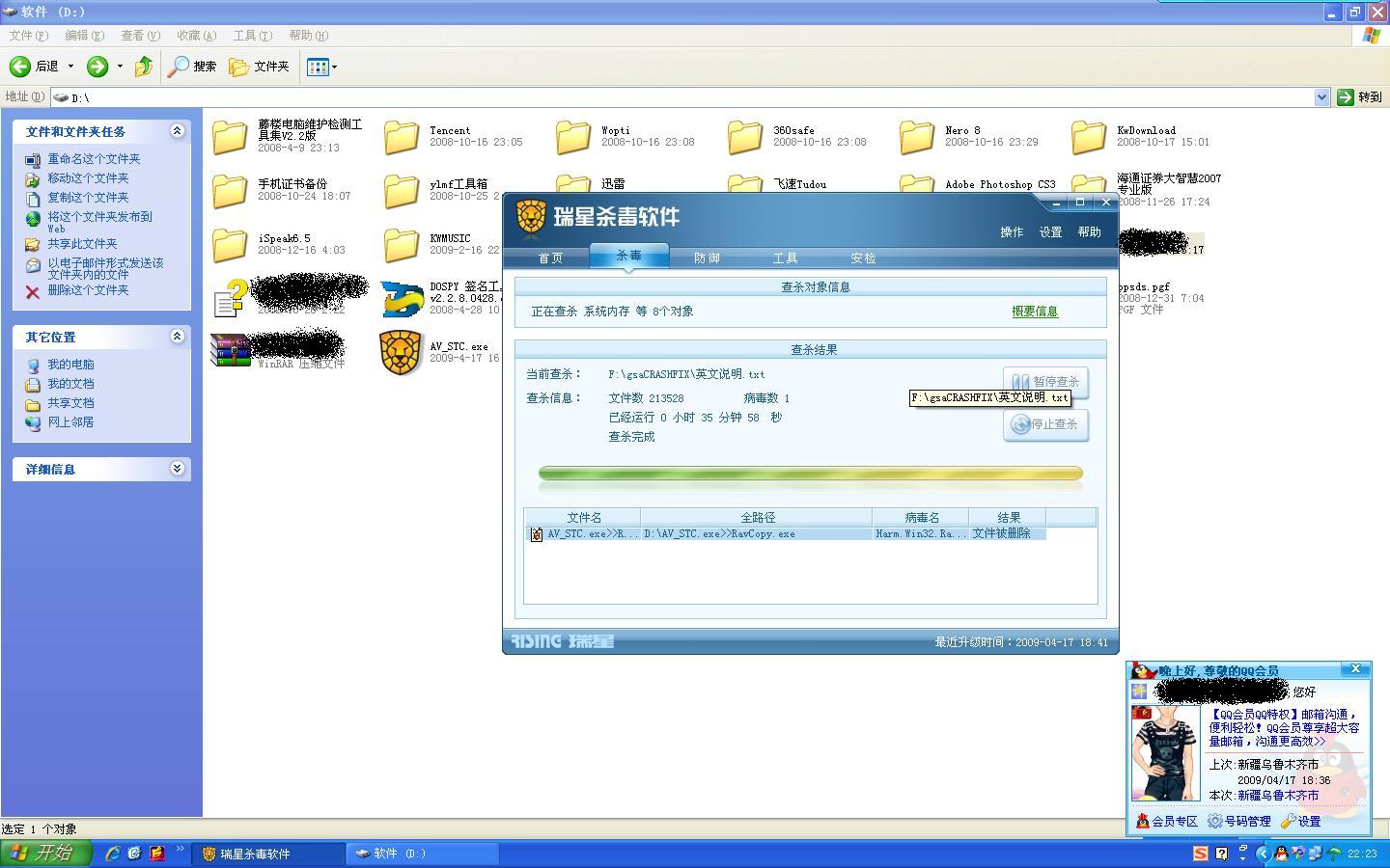 这是前几天例行扫描的时候瑞星杀毒软件将我前不久制作的瑞星安装包查出病毒!第一次亲自体会瑞星自己打自己嘴巴!