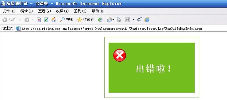 只有完成产品注册,才能享受软件升级服务,升级向导程序将引导您完成产品注册。 瑞星产品注册页面已经在您的默认浏览器中打开,请立即访问该页面进行产品注册。”并且弹出网站----“出错拉” 3个字谁帮帮我,到底是怎么回事????