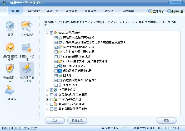 1、打开卡卡安全助手——电脑使用痕迹清理——清理: