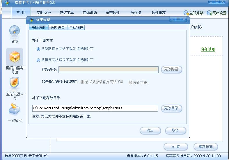 D:\补丁\ 然后再修复漏洞试试,如果仍修复不了,则进入D:\补丁\目录下,关闭所有的杀毒软件监控程序等,然后手动运行补丁安装程序。