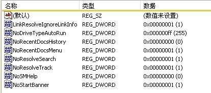 我在单位的计算机的【HKEY_CURRENT_USER\SOFTWARE\Microsoft\Windows\CurrentVersion\Policies\Explorer】子项下,只有“NoDriverTypeAutorun”这一个值项,不知道你的怎么这么多,估计是被什么东西优化过了,如果你愿意做个小白鼠的话,可将该注册表子项下除“NoDriverTypeAutorun”外的所有值项备份后删除,个人感觉感觉应该没啥问题,但不能打包票……:default3: