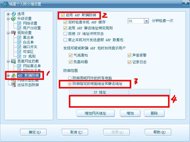 取消2处勾选,然后检查3处的勾选,不能选上面的“防御局域网中的所有电脑”。