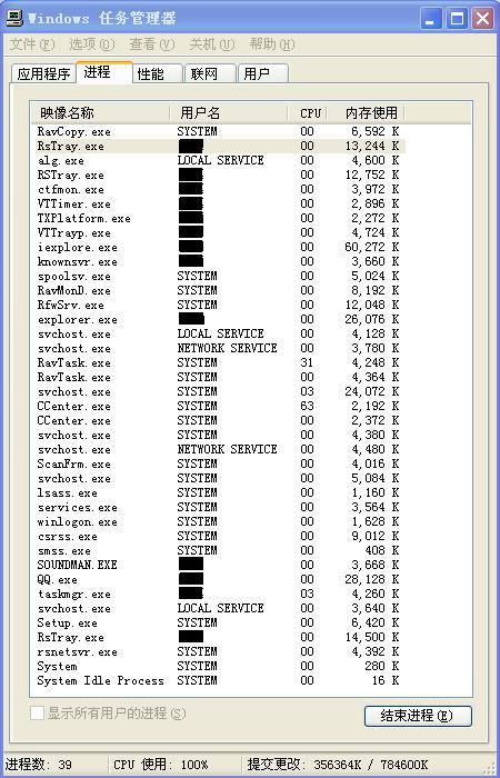 今天下午瑞星升级之后,电脑就很卡,在任务管理器里面的RavTask.exe CCenter.exe两个进程占用CPU过高,接近100%.,而且无法结束进程.截图如下,请坛子里的高人帮忙看看是怎么回事呀.