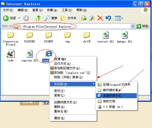 在C:\Program Files\Internet Explorer中找到IE主程序,右键如下图,发送新的快截方式