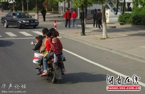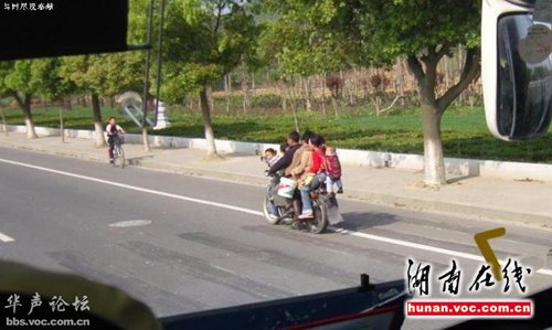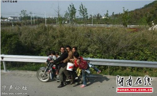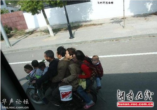 图片显示,摩托车上有八个人,一个小伙子手里拎着一个桶,三个小孩坐在摩托车前面的油箱上,最后面的妇女还背着一个婴儿。拍照的人在一辆客车上,摩托车一开始与客车并行,随后,加速超过客车并越走越远。