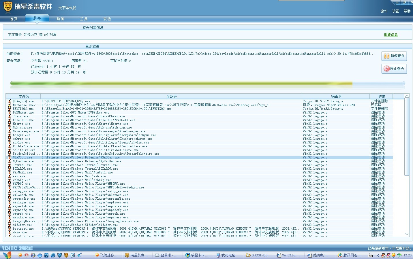 然后我用GHOST 还原了系统盘,再次将瑞星升级到最新版本后,开始查杀所有病毒,全部查杀完后,我打开其他硬盘的一瞬间,瑞星再次被干掉了。