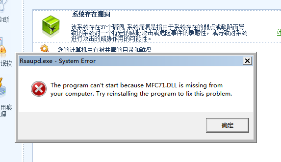 你的MFC71.DLL丢失了。附件是WINDOWS 7(32位系统)的MFC71.DLL.下载后解压到system32目录下。重启。试试。附件: