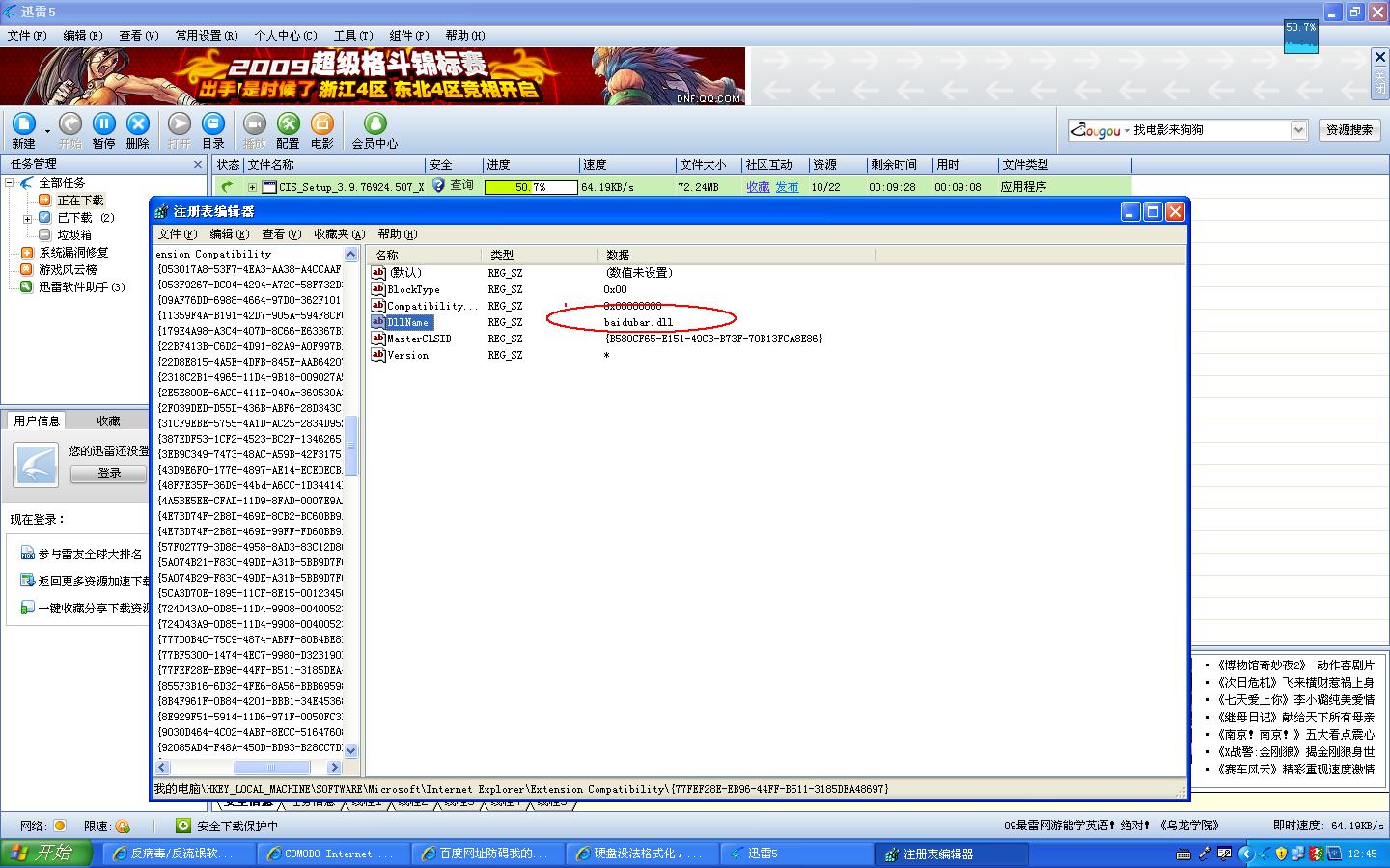 建议用强删工具删除C:\Program Files\Baidu\iexp\BDSrHook.dll这个文件后,然后再清理百度搜索钩子在注册表和浏览器加载项上添加的项目(红色)。